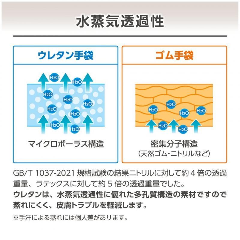 GB/T 1037-2021 規格試験の結果ニトリルに対して約4倍の透過重量、ラテックスに対して約5倍の透過重量でした。ウレタンは、水蒸気透過性に優れた多孔質構造の素材ですので蒸れにくく、皮膚トラブルを軽減します。