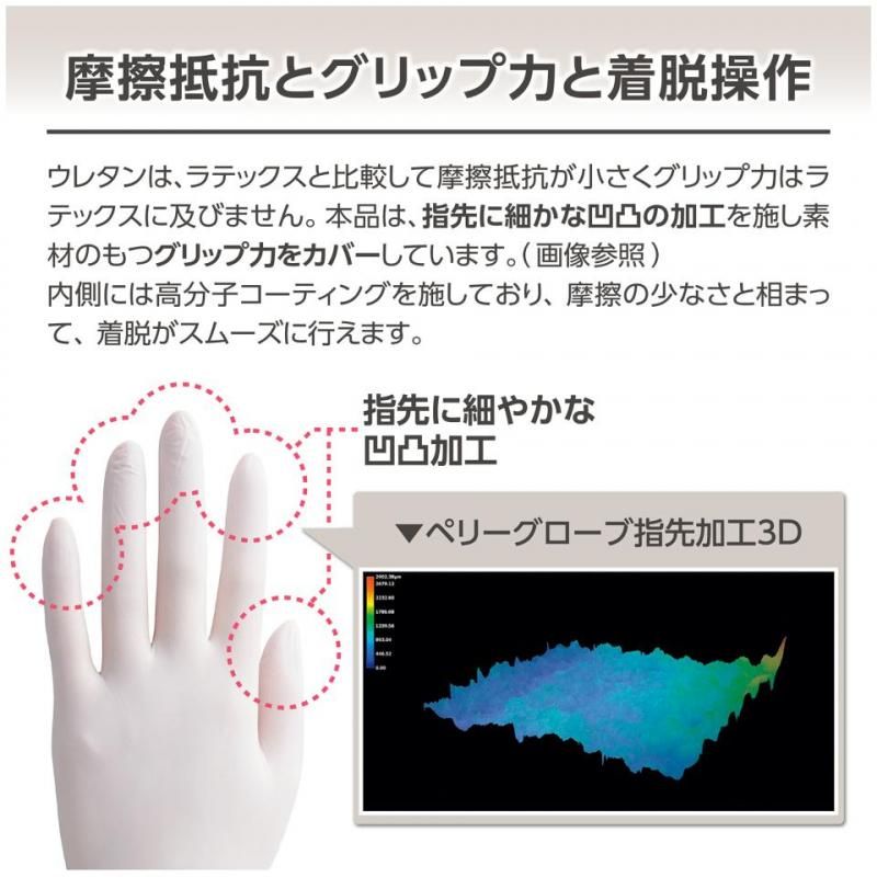 ウレタンは、ラテックスと比較して摩擦抵抗が小さくグリップ力はラテックスに及びません。本品は、指先に細かな凹凸の加工を施し素材のもつグリップ力をカバーしています。